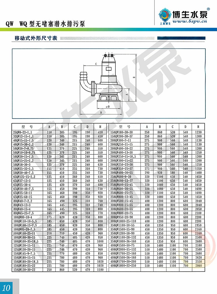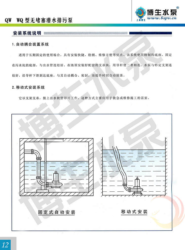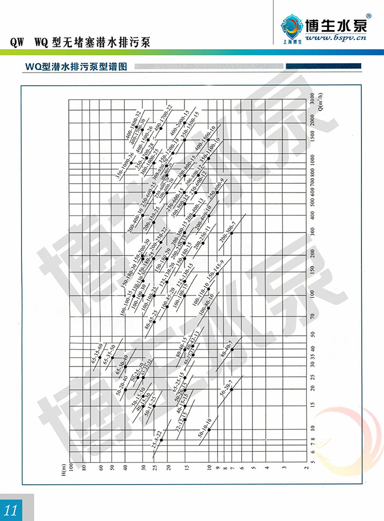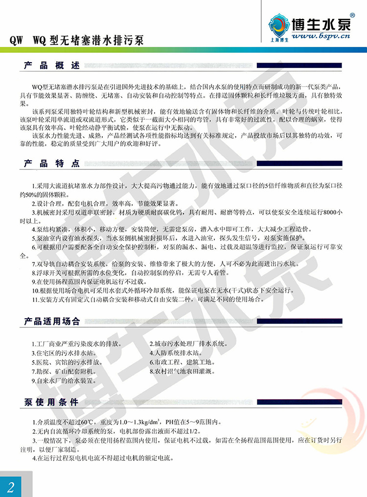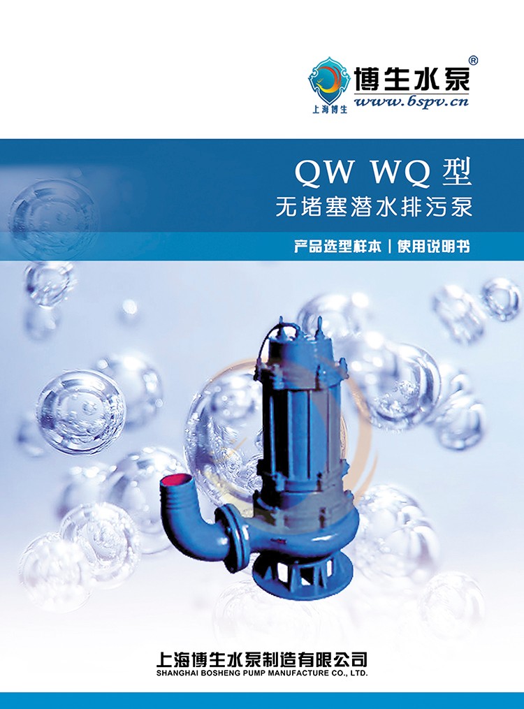 產(chǎn)品概述: 博生牌QW型無(wú)堵塞潛水排污泵,是引進(jìn)國(guó)外高效節(jié)能無(wú)堵塞排污泵,組織本單位技術(shù)力量研制而成,各項(xiàng)性能標(biāo)均達(dá)到或超過(guò)國(guó)內(nèi)外同類產(chǎn)品技術(shù),由于采用獨(dú)特的單通道葉輪,動(dòng)密封采用兩組特殊材料的硬質(zhì)合金機(jī)械密封裝置、電機(jī)用油室隔開(kāi),具有無(wú)堵塞、經(jīng)久耐用、型線準(zhǔn)確、使用修方便、效率高、節(jié)能顯著,是我國(guó)泵類新?lián)Q代的新產(chǎn)品,深受用戶歡迎。該泵有多種型號(hào)和不同的結(jié)構(gòu)形式可供選用。 QW型無(wú)堵塞潛水排污泵由電機(jī)與泵兩部分組成,二者通過(guò)油隔離室及機(jī)械密封組件隔開(kāi),屬機(jī)電一體化產(chǎn)品,電機(jī)與泵合用同一軸(轉(zhuǎn)子)整個(gè)水泵長(zhǎng)度短,結(jié)構(gòu)緊湊。配備多種保護(hù)裝置,使得泵運(yùn)行可靠,其主部件作用如下:信號(hào)線1:配備全保水泵控制柜,對(duì)泵實(shí)行全方位保護(hù),包括漏水,斷相、短路、過(guò)熱、電機(jī)過(guò)載等項(xiàng)目.電機(jī)定子8:采用B級(jí)或F級(jí)絕緣。漏水探頭11:該元件裝在油室內(nèi),當(dāng)機(jī)械密封損壞后,水進(jìn)入油室,探頭可發(fā)出信號(hào)由控制系統(tǒng)對(duì)泵實(shí)施保護(hù)。機(jī)械密封13:采用雙道串聯(lián)密封,選用新型硬質(zhì)耐腐碳化鎢材質(zhì),具有密封可靠、耐磨、壽命長(zhǎng)等特點(diǎn)。 葉輪17:葉輪采用單流道或雙道結(jié)構(gòu),具有很強(qiáng)的通過(guò)能力,能夠通過(guò)大的物料及纖維垃圾,減少堵塞、纏繞的故障。泵體15:與葉輪配用,使得泵具有高的效率。密封環(huán)18:裝在泵體口環(huán)處,當(dāng)葉輪因運(yùn)行而使口環(huán)處磨損,可換密封環(huán),以保證泵以佳效率運(yùn)行。