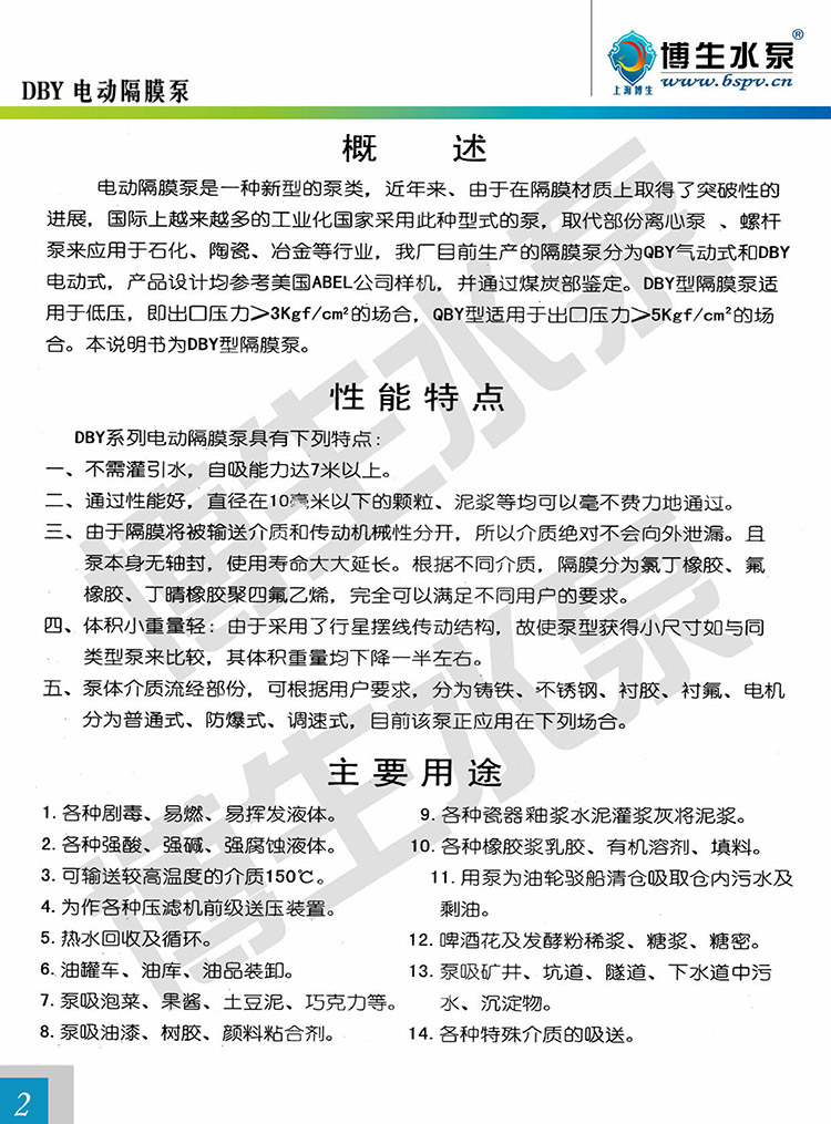 博生公司生產(chǎn)的上海博生DBY-15型電動(dòng)隔膜泵是一種新型的泵種,近年來,由于在隔膜材料取得了突破性的進(jìn)展,國際上越來越多的工業(yè)化國家要用此種型式的泵,上海博生DBY-15型電動(dòng)隔膜泵代替部份離心泵、螺桿泵,來應(yīng)用于石化、陶瓷、冶金等行業(yè)。